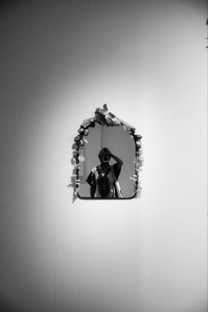 The door of disorder, displayed behind the drapery, is decorated by dispersed daisies. It directs you beyond the demarcation of doomed dolour—into a deluding dreamland.